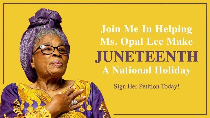 It's a new year and a new legislative session. The Juneteenth bills in the Senate and the House of Representatives must be reintroduced for Congress to take them up again so they can hopefully be passed before Juneteenth 2021. At 94, Ms. Opal is giving it all she's got to keep the pressure on and the awareness high that this is something people want to happen, but she needs your help to do it. You have already signed her petition, but she needs you to share and forward the information to friends and family who have not. This month - Black History Month - she wants to take another 1.5 million signatures to DC for a total of 3 million "to show that it's not just one little old lady in tennis shoes who wants this." Will you commit to share this picture on your social platforms so she reaches this goal in the next week?