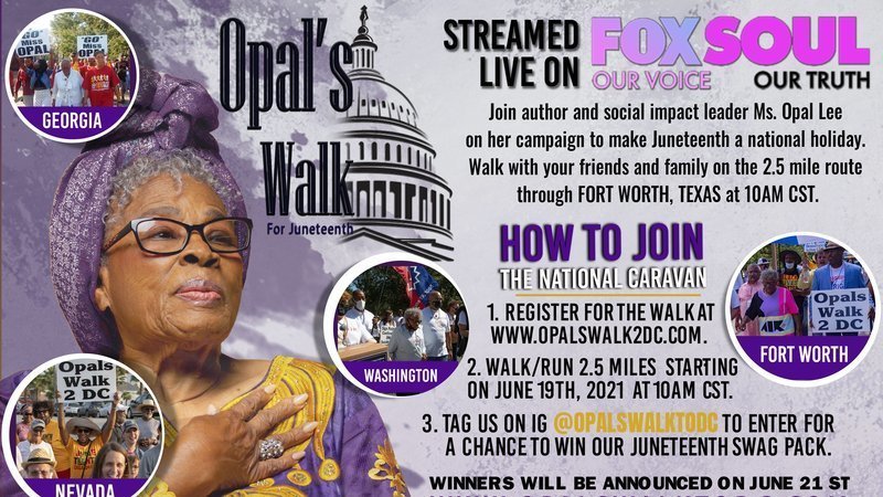 You've signed the petition. You've asked others to sign the petition. You've posted it on all your social media accounts, but you still want to do more to help Ms. Opal gain the awareness that Juneteenth needs to be a national holiday. Here's your chance to break the internet by joining her on her signature 2.5-mile walk, Saturday, June 19 all across America then share on all platforms with her hashtags so that we break the internet if possible.