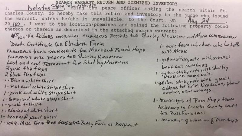 This is what they found in the bag. This was revealed in a closed court hearing today in St. Charles County. Chris Hayes and Fox 2 News took the picture. Why didn't they take the trash to the curb? Why are they driving away with a bag of trash? Were these the clothes that ties them to Betsy's murder? What were they doing with Betsy's 2005 tax paper? Betsy was not killed till 2011? St. Charles County and the O'Fallon Police Department are awesome. They are leaving no stone unturned.