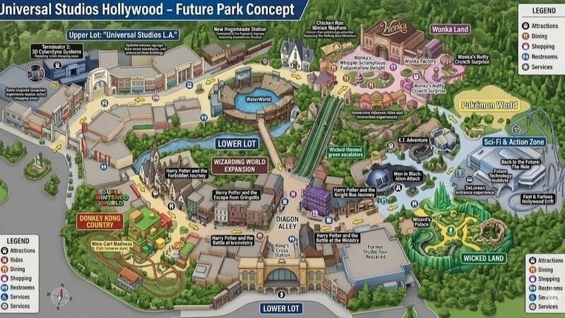 To create a realistic, state-of-the-art concept art park map for Universal Studios Hollywood, this design reimagines the theme park as a fully immersive, next-generation entertainment destination.