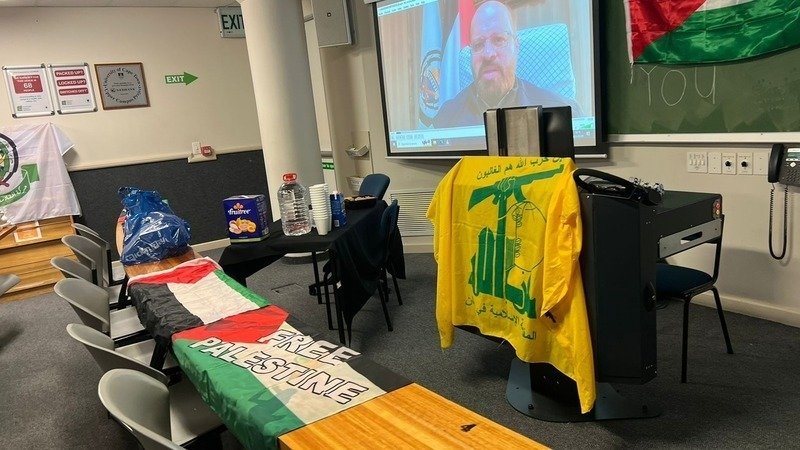 As part of the meeting, two terrorist representatives, Nasser Abu Shariff from PIJ, and Dr Khalid Qodumi from Hamas, addressed UCT students in a UCT venue where flags from organisations that seek to remove Israel from the face of the earth, Hezbollah and Hamas, were hung by the PSF.