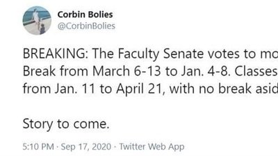 The Faculty Senate at UF has voted to move spring break from March 6-13 to January 4-8 for ‘COVID related reasons’. If they really cared about COVID they wouldn’t have allowed 17k fans into the football stadium for football games, but money is always the motivator, isn’t it? Changing spring break from March to January creates a semester that has little to no time off at all, and this is unhealthy for student, faculty and staff mental well being. We are already going home for Winter Break, what do they expect this change to do?