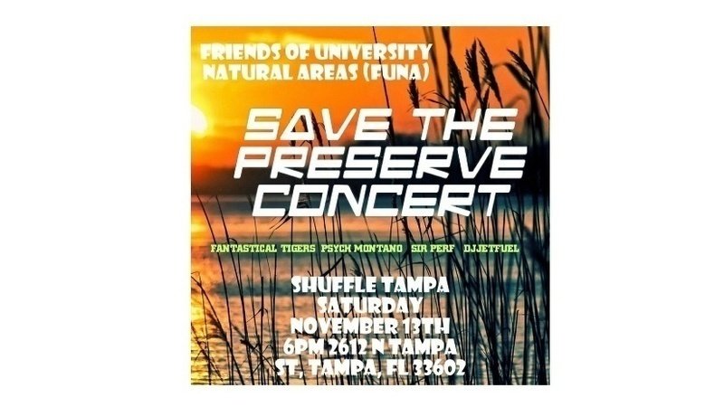 We will be at Shuffle in Tampa on November 13th at 6pm for a special show to support our efforts to save the USFFP. Come out to enjoy local music and hear the latest updates about our cause, including some big announcements! We will also have some awesome Save the Forest Preserve t-shirts, magnets, and posters available for purchase. Proceeds will support our efforts as well as the great local artists we’ve partnered with.
