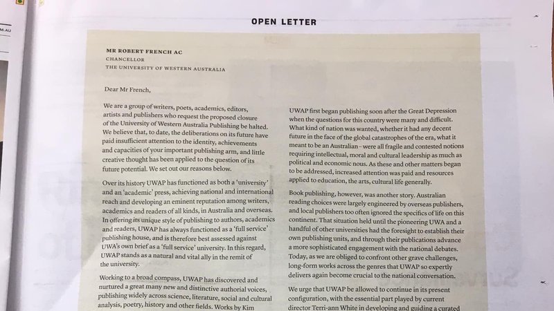 The two Open Letters that have been circulating have both been published – one in the Saturday Paper on the weekend (including Helen Garner, David Malouf, Christos Tsiolkas and Melissa Lucashenko - pictured), and one here: https://www.dropbox.com/s/uf4puo70silp6wm/An%20Open%20Letter%20Against%20the%20Closure%20of%20UWAP%20%28official%20version%29.pdf?dl=0 (including J M Coetzee, Kim Scott, and Thomas Keneally)
