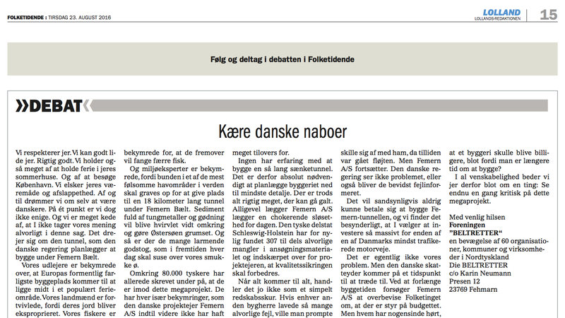 in Dänemark ist jetzt unser offener Brief an unsere dänischen Nachbarn erschienen. Die Zeitung „Lolland-Falsters Folketidende“ hat ihn veröffentlicht. Unser Ziel ist es, auch in Dänemark für eine neue und offene Diskussion über das stark umstrittene und Milliarden teure Mega-Projekt Belttunnel zu sorgen. Dänemark plant diesen dann 18 Kilometer langen Tunnel. Im Vergleich zu Deutschland gibt es in Dänemark bislang deutlich weniger Widerstand. In dem Brief bitten wir daher die dänische Öffentlichkeit und Regierung, das Projekt neu und kritisch zu betrachten.