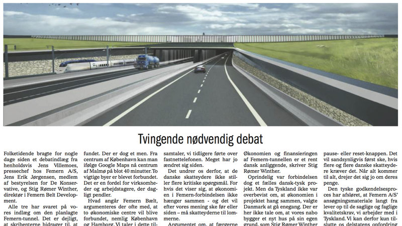 endlich konnten wir auch in Dänemark eine öffentliche Debatte über den Sinn bzw. Unsinn des gigantischen Milliarden-Projekts Belttunnel anstoßen. Jetzt gerade ist unser neuer Debattenbeitrag in der dänischen Zeitung FOLKETIDENDE erschienen.