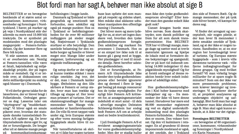 Wir BELTRETTER sind eine Initiative, der sich bereits zahlreiche Gemeinden, Parteien, Unternehmen, Organisationen und Vereine in Norddeutschland angeschlossen haben. Und wir werden immer mehr. In Gärten, auf Feldern, an Straßen in Norddeutschland stehen bereits mehr als 15.000 blaue Holzkreuze. Sie sind das Symbol des Widerstands gegen das geplante gigantische Bauprojekt Belttunnel. Und auch diese werden immer mehr. Uns alle hier eint, dass wir davon überzeugt sind: Der Fehmarnbelttunnel wäre ein verhängnisvolles, unwirtschaftliches, hoch riskantes, der Umwelt massiv schadendes Projekt. Und wir sind erleichtert, dass auch in Dänemark endlich eine Diskussion zu diesem Milliarden-Projekt aufflammt. Insofern bedanken wir uns für die hier in dieser Zeitung veröffentlichten Diskussionsbeiträge. Allerdings irritiert uns die Wortwahl. Da werden Begriffe wie „Schützengräben“ und „Schlammschlacht“ benutzt. Ebenso irritierend ist für uns das Verhalten der staatlichen dänischen Tunnelbaufirma Femern A/S. Unserer Meinung nach hat sie ein beängstigendes Eigenleben entwickelt. Sie handelt und kommuniziert zum Selbsterhalt. Und investiert offenbar hohe Budgets in Kommunikationskampagnen, die auf Politiker in Deutschland und Dänemark sowie auf die Bevölkerung beider Länder einwirken sollen.