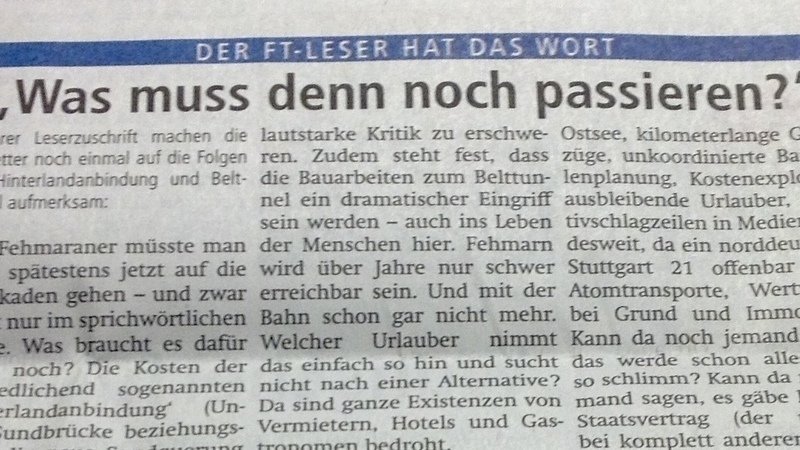 hier kommt unser Leserbrief, der heute im Fehmarnschen Tageblatt erschienen ist. Er gibt auch einen Überblick darüber, wie sich die Lage rund um Belttunnel und Hinterlandanbindung zuspitzt.