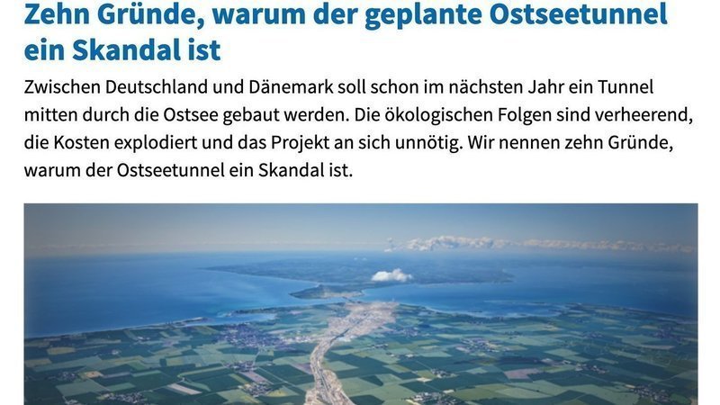 die Planung des drohenden Ostsee-Tunnels ist in vielerlei Hinsicht ein Desaster. Die Kosten explodieren schon vor dem Bau. Das erwartete Verkehrsaufkommen wird immer und immer weiter nach unten korrigiert. Die Umweltschäden werden verharmlost. Der Brandschutz ist nicht geklärt. Seltene Riffe verschwinden plötzlich von den Karten der Planer. ... Es ist nicht nur ein Desaster. Es ist ein Skandal.