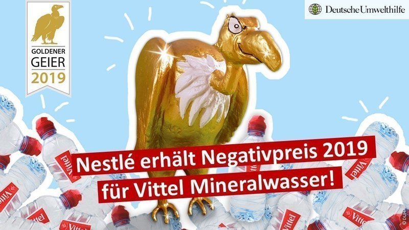 Liebe Unterstützer/innen! Wir haben Nestlé den Negativpreis Goldener Geier 2019 für die unsinnigste Einweg-Plastikverpackung überreicht. Ihr habt für das aus Frankreich importierte und mehrfach in Einweg-Kunststoff verpackte Mineralwasser Vittel abgestimmt. Wie wir nun weiter gegen die Plastikflut von Nestlé vorgehen, erfahrt ihr in unserem Newsletter. Wir halten euch darin gerne auf dem Laufenden!