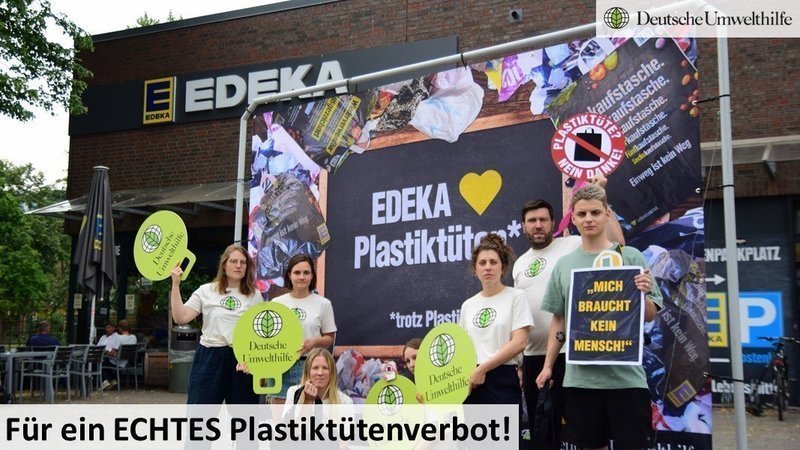 Liebe Unterstützer:innen, trotz des geltenden Verbots verkauft Edeka fleißig weiter ressourcenverschwendende, umweltschädliche Plastiktüten und vermarktet diese unverschämterweise auch noch als vermeintlich nachhaltige Mehrwegoption. Dass wir dieses unverschämte Greenwashing auf Kosten der Umwelt nicht länger akzeptieren, haben wir heute in einer großen Protestaktion zum Ausdruck gebracht. Unterschreibt jetzt unseren offenen Brief an Umweltministerin Lemke: Wir fordern ein sofortiges Aus dieser umweltschädlichen Wegwerftüten!