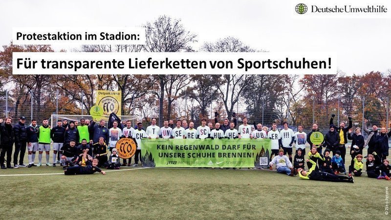Liebe Unterstützer:innen, für das Leder in den Schuhen der Hersteller Adidas und Nike brennt der Brasilianische Regenwald – eine Katastrophe für dortige Ökosysteme und das Weltklima! Wir haben unseren Protest direkt ins Stadion getragen und fordern die Unternehmen gemeinsam mit dem FFC Olympia dazu auf, ihre Lieferketten endlich transparent zu machen! Unterstützt auch ihr den Protest und schreibt jetzt eine Protestmail an die CEOs der Unternehmen!