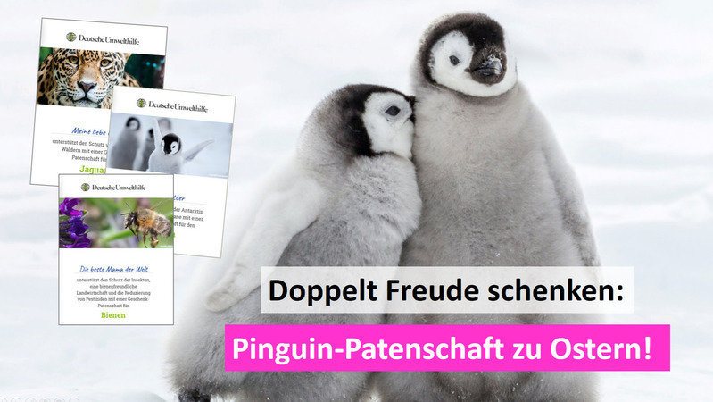 Mit einer Geschenk-Patenschaft für den Pinguin setzt du dich gemeinsam mit uns für effektiven Meeresschutz in der Antarktis ein und hilfst die Pinguine vor der Zerstörung ihres Lebensraums zu schützen. Verschenke jetzt eine Pinguin-Patenschaft zu Ostern und mach deinen Liebsten damit eine ganz besondere Freude!