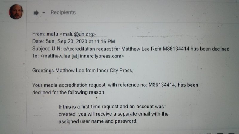 Inner City Press on September 5, 2020 submitted a formal application to cover this 2020 UNGA, including for access to the UN' online briefings, to ask questions about such crises as Cameroon, Yemen and China's expansionism. Receipt has been confirmed: photo here.