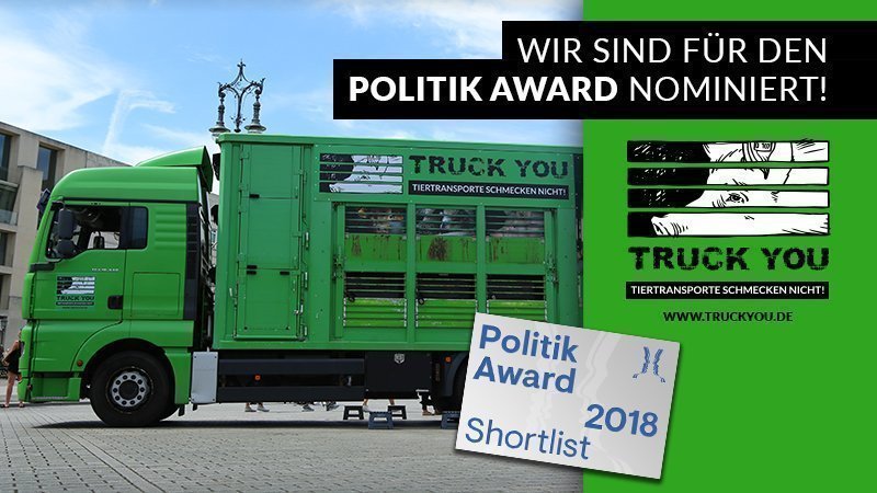 Unsere Kampagne gegen Tiertransporte ist für den Politikaward 2018 nominiert! Damit werden jedes Jahr die besten politischen Kampagnen des Jahres ausgezeichnet. Wir freuen uns jetzt schon über die Anerkennung und hoffen, so noch mehr Menschen mit unserer Botschaft „Tiertransporte schmecken nicht!“ zu erreichen und zu einem Umdenken in der Massentierhaltung bewegen zu können.
