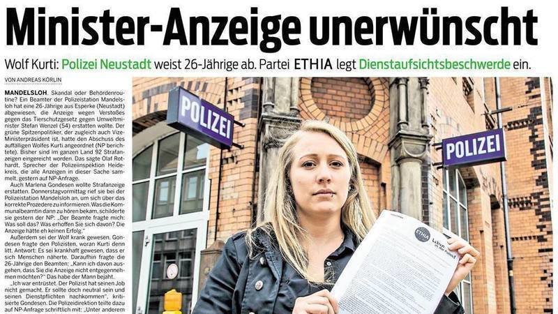 Die Strafanzeige einer Unterstützerin, die sich (wie bisher mindestens 91 weitere Menschen) unserer Strafanzeige im Tötungsfalle des Wolfes "Kurti" anschlossen - siehe www.ethia.de- wurde von einer Polizeidienststelle im Raum Hannover abgelehnt. Wir stellten umgehend Dienstaufsichtsbeschwerde gegen den Beamten beim Polizeipräsidenten in Hannover und zeigten die dienstpflichtsverletzung bei der Staatsanwaltschaft Hannover an. Die Neue Presse berichtet.