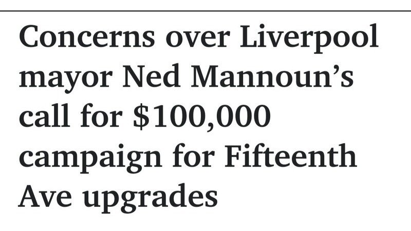 AFTER the Council meeting held on Wednesday the 28th February 2024 there are "Concerns over Liverpool mayor Ned Mannoun’s call for $100,000 campaign for Fifteenth Ave upgrades."