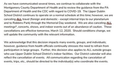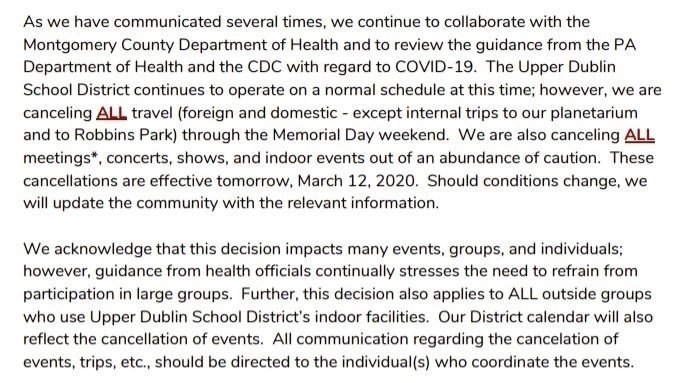 The school district of Upper Dublin has cancelled all travel, shows, concerts, field trips, after school activities, and school events until Memorial Day Weekend. This means no proms, no Disney trip, no musicals, no sports, nothing. Yet we are still in school for 8 hours a day in germ filled classrooms surrounded by other teenagers. How is that different? There are no cases in Upper Dublin, and these events are MONTHS in advance, yet they had the AUDACITY to make these ridiculous decisions. GIVE US BACK OUR RITES OF PASSAGE AND THE THINGS WE HAVE BEEN LOOKING FORWARD TO THIS SINCE FRESHMEN YEAR.
