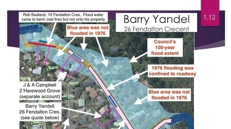 In Fendalton Crescent, several eyewitnesses disagree with Council's flood map showing their properties flooded in the 1976 flood. It didn't happen. It only flooded down the road, not on their properties. Council did not 'ground-truth' their flood map against 1976 eye-witness accounts of the biggest flood in Pinehaven residents' living memory.