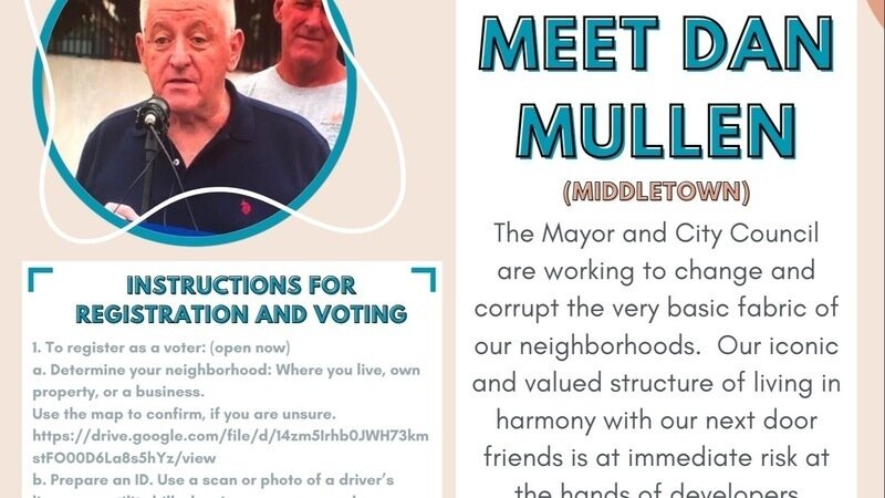 Please cast your vote for Dan Mullen to represent the Middletown Community on the Uptown Community Planning Committee. Dan has been a tireless leader in striving to have our community heard in the opposition to the Kettner and Vine Mega Shelter. Dan is a long time resident of the community and is not a political lobbyist like his opponent. Please vote Dan Mullen