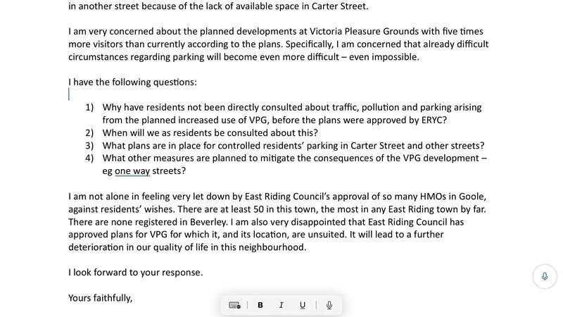 The image today shows the text of a message sent to ERYC by a resident living in one of the streets leading from Boothferry Rd to VPG I understand.