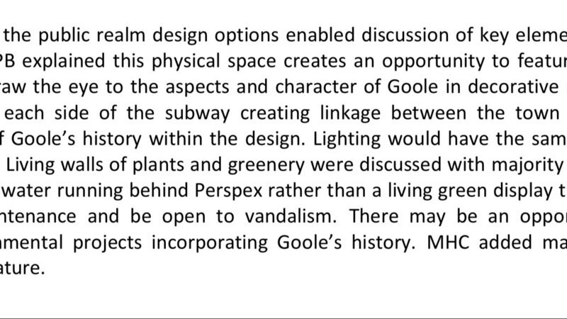 The plans for the area from the railway station to the clock tower are not welcomed by many residents; the plans are viewed with derision. The library and museum users want the library kept in the heart of the town with the museum, not moved to the new leisure centre (welcome though that is by a lot of people). The area round the Victoria Pleasure Grounds is unsuited to the point of not being safe for what is proposed. There is already a new 3G football pitch specially built to serve the Goole area with considerable sums of money raised by crowdfunding and other donations. Getting rid of the 400m running track will be very detrimental to athletes as the nearest tracks are in Doncaster and Hull. The planned “hospitality venue” would be better located in the town centre where more people can access it and it can provide more “footfall” for the businesses round there.