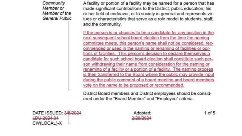 - December 2024- Discussion and disagreement among board members over the Naming Committee process which resulted in 2 trustees (Cuzela and Calhoun) voting against the Naming Committee's recommendation for Elementary #48 (James and Mitzi Cross Elementary). Victor Perez told the policy committee (himself, Cuzela and Calhoun) to revise the CW Local Naming Facilities policy and bring it back to the board for consideration.