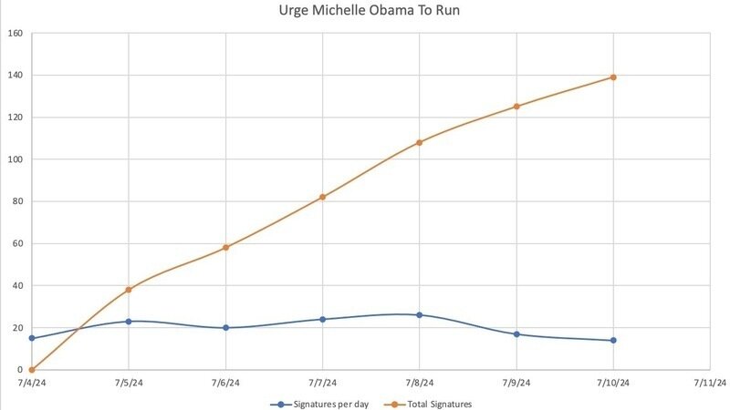 I'm worried that this emergency isn't going to be addressed in time. We have a threat to democracy, decency, and truth coming in November. I believe the only way to stop this is encouraging Michelle Obama to please step up for us. 14 new signatures yesterday. Thank you for your support, I think we need a lot more signatures to properly get her attention, and show her how wanted she is.