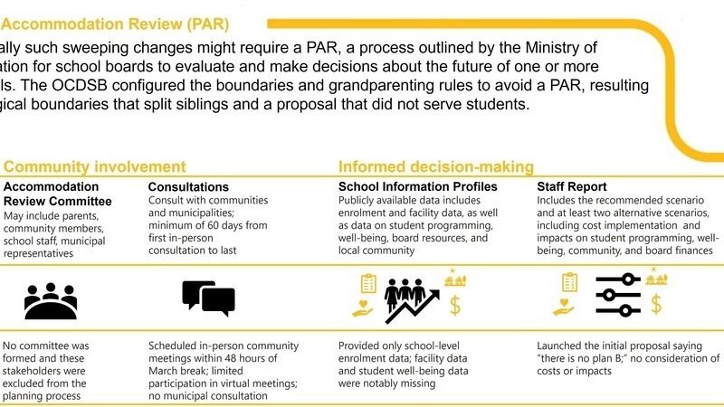 The image for this update provides an overview of what is required in a PAR process and how the OCDSB is currently failing to meet these standards. There is also an infographic to help you understand the EPR changes and explain the issues to others. Trustees should not be asked to approve a plan with such lasting consequences when so much critical information remains missing or unclear.