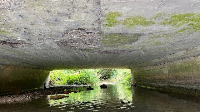 At our recent Meeting of the Parish, a villager wondered what state of repair our bridge was in and volunteered to go and take a peek. He soon reported back that all was not well. The photo above shows the rusting steel rebar reinforcement under the eastbound carriageway and clear spalling where the rust has forced the concrete apart. There are also signs of some pretty shoddy repair attempts (top left of photo) with evidence of rust breaking through those. So, just how corroded is that rebar, how strong is the road deck, and has the roadbed started to delaminate above the rebar?