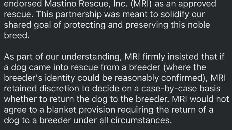 Mastino Rescue announced they are cutting ties with the USNMC, likely to avoid USNMC cutting ties with them first. However, their statement conveniently left out the real issue: their lack of transparency and refusal to return dogs to reputable breeders, which led to wasted donations, people getting attacked by dogs, and less space for dogs who actually needed it.