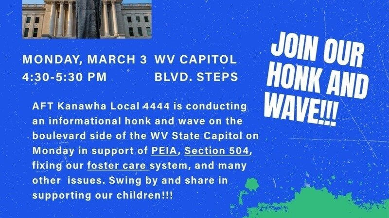 We will be at the WV Capitol, boulevard side, for a Honk and Wave on Monday, March 3 from 4:30-5:30 PM. This event is to show support for PEIA, Section 504, and our foster care system along with other issues. You are welcome to stand with us on the sidewalk! We will have about 50 signs printed for this event that will be available first come first serve. We would also love to have you participate by driving by and honking in support of these causes!