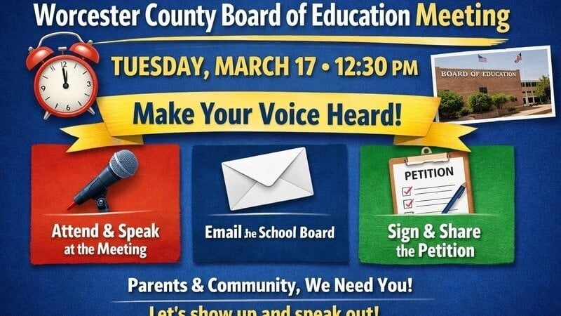 Just a reminder to Worcester County parents and community members that the Worcester County Board of Education meeting is tomorrow (Tuesday) at 12:30 PM.