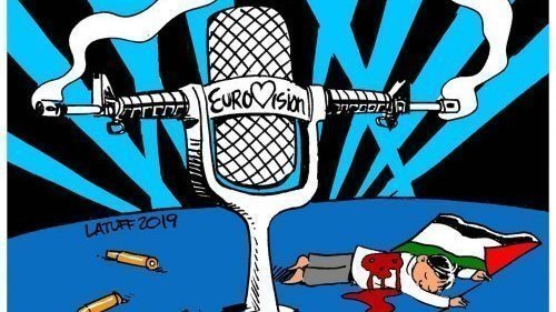 Nous lançons, avec un nouveau dessin de Carlos Latuff, un défi à tous nos lecteurs et lectrices : nous envoyer des dessins, photos montages, ou courtes vidéos, illustrant l’indécence qu’il y a à participer à l’Eurovision en Israël. Des cadeaux palestiniens pour les vainqueurs de ce concours !