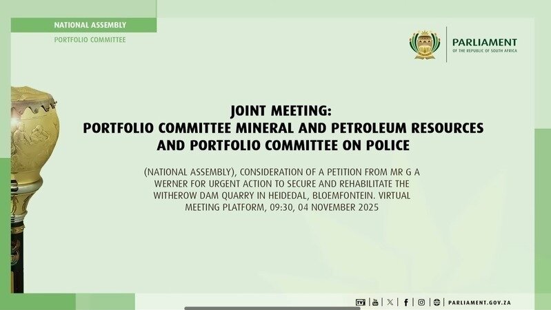 On November 4, 2025, during a joint parliamentary session, we delivered a compelling overview of the dangers at the Witherow Dam Quarry—the illegal operations, environmental hazards, and the devastating loss of lives, including the recent tragedy of 20-year-old Benjamin van Wyk on October 16. We highlighted the urgent need for rehabilitation, enforcement of regulations, and protection for our vulnerable communities in Mangaung Local Municipality.