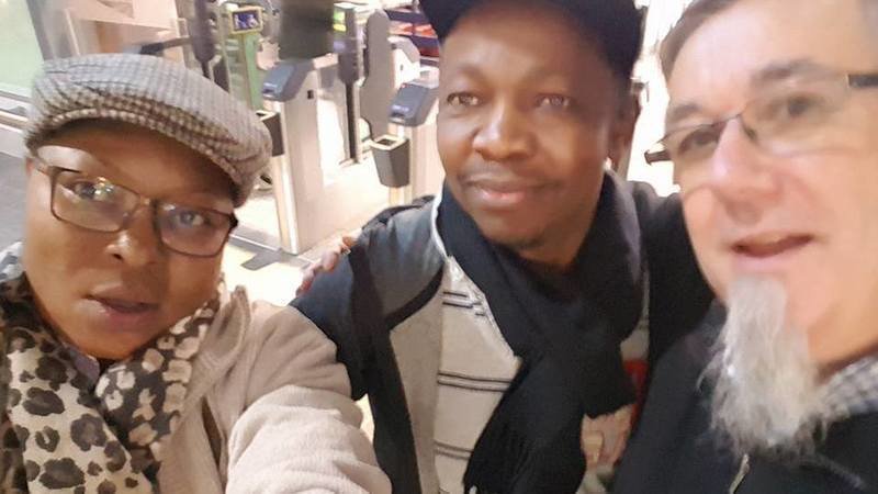The photograph shows Ronnie Apata, Jimmy Kyesswa (middle) and Tony Openshaw at Manchester Piccadilly train station.