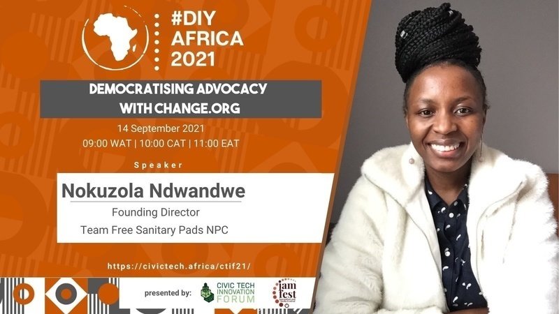 Join Team Free Sanitary Pads NPC Founding Director, Nokuzola Ndwandwe, at the #DIYAfrica Jam Fest and Civic Tech Innovation Forum - in collaboration with Change Dot Org Foundation.