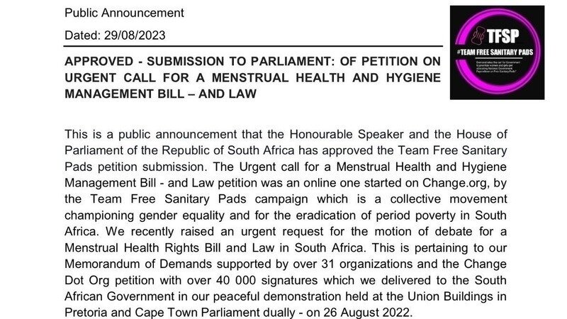 This is a public announcement that the Honourable Speaker and the House of Parliament of the Republic of South Africa has approved the Team Free Sanitary Pads petition submission. The Urgent call for a Menstrual Health and Hygiene Management Bill - and Law petition was an online one started on Change.org, by the Team Free Sanitary Pads campaign which is a collective movement championing gender equality and for the eradication of period poverty in South Africa. We recently raised an urgent request for the motion of debate for a Menstrual Health Rights Bill and Law in South Africa. This is pertaining to our Memorandum of Demands supported by over 31 organizations and the Change Dot Org petition with over 40 000 signatures which we delivered to the South African Government in our peaceful demonstration held at the Union Buildings in Pretoria and Cape Town Parliament dually - on 26 August 2022.