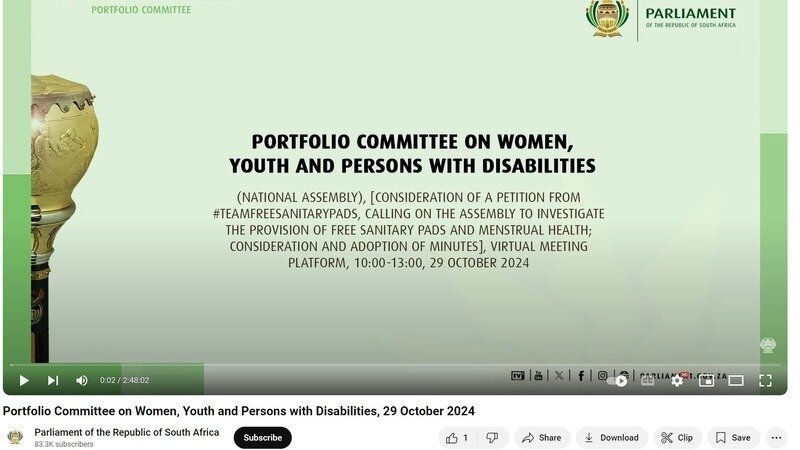 Please receive first RSA Parliament Portfolio sitting on our collective Petition and call for a Menstrual Health Rights Bill and Law presented by Ms. Nokuzola Ndwandwe, Menstrual Health Rights Activist.