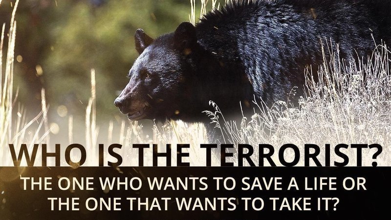Animal and environmental advocates are often called terrorists because they disrupt the norm and seek to end exploitative and cruel industries and traditions of harming and killing animals. Our reverence for animals and the environment threaten those who wish to destroy what we love and respect. We challenge the deep-seated conscious that resides in those who profit from and find joy in the pain, suffering, and death of animals. Because of the acts of actual terrorists, Washington's Spring Bear Hunt may be reinstated this year after being halted following a 4-4 vote by commissioners back in November.