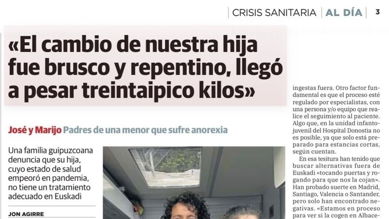 Nuestra hija ingresó el lunes 17 en Albacete, a 700km de su casa, y aunque creemos que allí va a estar mejor, es una situación intolerable y una vergüenza para el sistema vasco de Salud.