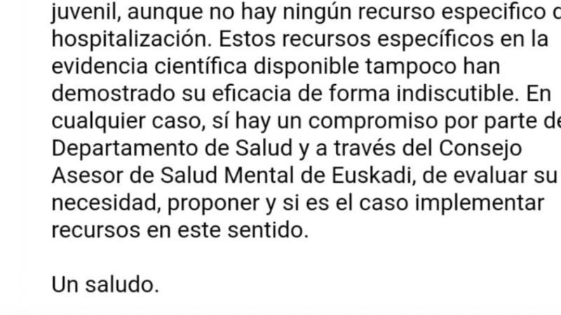 En los últimos meses y a través del equipo de Change.org nos hemos puesto varias veces en contacto con el Departamento de Salud del Gobierno Vasco para preguntarles si finalmente van a aumentar los recursos en TCA. Dijeron que iban a valorarlo, según lo que os respondieron a muchos de vosotros en los emails que enviasteis (foto de arriba) pero siguen sin respondernos. Necesitamos seguir con esta petición adelante para que vean que NO NOS VAMOS A RENDIR. PACIENTES COMO NAGORE NOS NECESITAN. EL GOBIERNO VASCO DEBE REACCIONAR.
