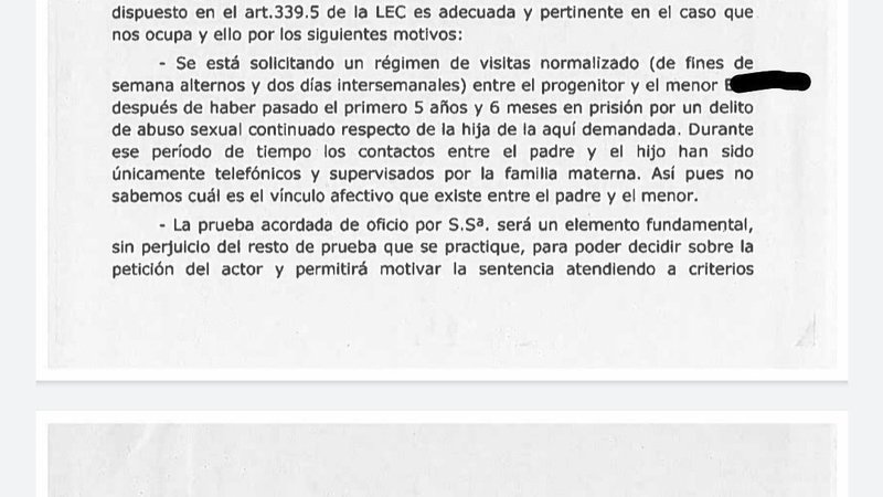 Aun así fiscalía y el juzgado deciden seguir valorando si se le concede un régimen de visitas, mi hijo no conoce a su padre ( estuvo en prisión desde que el niño tenía 5 años) Ni mi hijo ni yo deberíamos después de 6 años seguir con una vida judizializada, afectando a toda mi familia, mi hija de la que abuso convive conmigo y ahora tiene 17 años, se da cuenta de todo y teme que su agresor tome repesalias, lo único que quiero es poder continuar con mi hijo a salvo, un pederasta no debe tener a ningún menor cerca, ni hijo corre peligro.