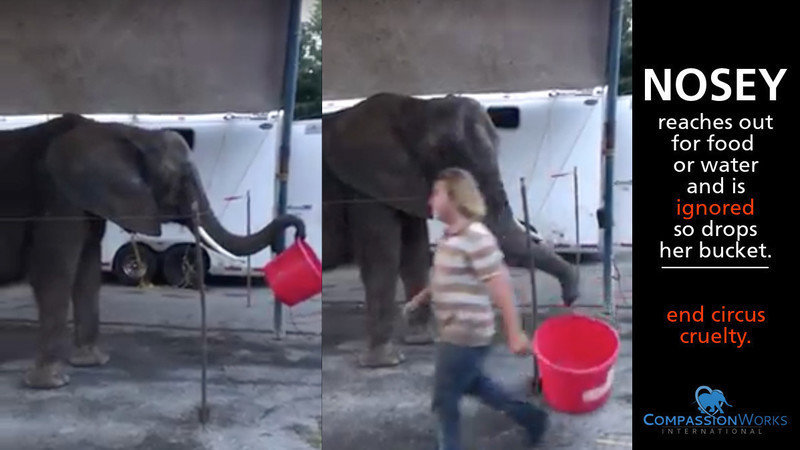 Friends: Since our last update, Nosey has been found traveling throughout northeast Ohio giving rides and performing stupid tricks at "circuses" held primarily in parking lots. Sadly, today we saw video of her out of Hanoverton, OH reaching out to the Liebel family son for food or water. She picked up her bucket and reaches out to him with it, yet he chose to ignore her entirely. She then dropped her bucket when she realized he would pay her no attention. It was heartbreaking to see how they treat "family." The type of tiny circus that she is currently performing in does not invest in marketing, so there is no telling where she might pop up. She is currently about 40 miles southwest of Youngstown, OH in the small town of Hanoverton. Hanoverton is hosting their first, and we hope, their last circus. If you live in or near Hanoverton, please write to government officials there to let your thoughts on circus cruelty be known. Nosey (currently being called Tiny) has been moving every 3-4 days within a few hours drive of her previous location. So if you are in northeast Ohio, or in the Columbus, OH or Pittsburgh, PA areas, please be vigilant for any circus tents that pop up. If you see one, please contact us straight away at info@cwint.org with an address and any other information you can find. The hearing the Liebel family must attend with the Florida Fish and Wildlife Commission (FWC) regarding their revoked permit is set to take place in October. We suspect they may not return Nosey to Florida until which time they manage to resolve their permitting issues with the FWC. The family has been raising money for legal assistance to help with their case, but thus far have not been successful at raising everything they are seeking. As updates arise on that situation, we will continue to update this petition. Thank you again for your continued interest in Nosey and for helping CWI to pursue a better life for her. Finally, we hope that you will consider supporting us by making a tax-deductible donation of any amount at cwint.org/donate so that we can continue our work for Nosey and all animals still suffering inside the circus. Thank you, as always, for caring. For the animals, Carrie Carrie LeBlanc, M.A. Executive Director CompassionWorks International Ps. Please continue to share Nosey's petition: https://www.change.org/p/usda-and-congress-please-help-to-rescue-an-abused-elephant-named-nosey. You can also read all of our previous updates on her case with the FWC by scrolling to the "updates" section of the petition. Thank you!
