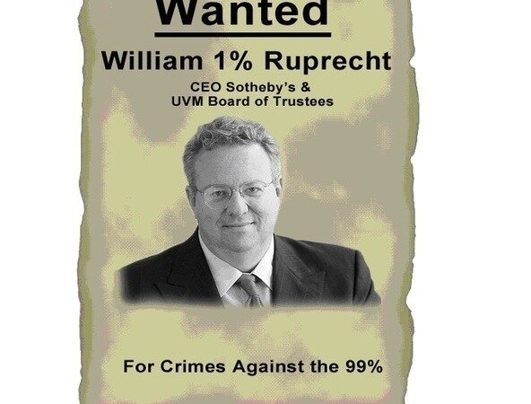 UVM Trustee Bill Rupprecht is the CEO of Sotheby's auction house in New York City. Despite earning more than $700 million in profit in 2010, the company pushed their art handlers out onto the street and has kept them locked out of their jobs for almost 6 months now. The company is demanding the following concessions: the right to eliminate the workers' 401k plan, a 10% reduction in pay, and the phasing out of full-time union jobs by replacing all vacant positions with low wage non-union temporary workers who would have no benefits, no job security, and no future!