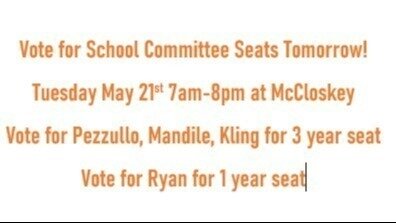 School Committee Elections are tomorrow, Tuesday May 21st! Voting is at the old McCloskey Middle School (62 Capron St).