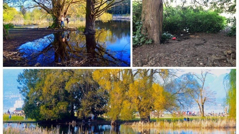 On Saturday evening April 17, 2021 I was taking photos at Jericho Beach Duck Ponds in the area seen in the photo and video, when I was shocked to observe that the duck ponds were being used as a pissoir by large groups of intoxicated young people, lining up to pee in the bushes, or against the trees, by the pond, several in full view of anyone walking by, leaving a pile of TP in their wake for Park Board maintenance staff to clean up.