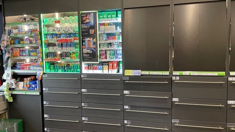 On the left of the photo is a full display of a range of vaping products, which also contains highly addictive nicotine products. They are displayed in highly colourful, child friendly packaging. In some stores they are actually on the counter, where people can pick up the products to make their selection.