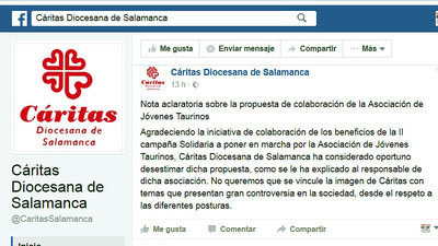 “Agradeciendo la iniciativa de colaboración de los beneficios de la II campaña Solidaria a poner en marcha por la Asociación de Jóvenes Taurinos, Cáritas Diocesana de Salamanca ha considerado oportuno desestimar dicha propuesta, como se le ha explicado al responsable de dicha asociación. No queremos que se vincule la imagen de Cáritas con temas que presentan gran controversia en la sociedad, desde el respeto a las diferentes posturas”.