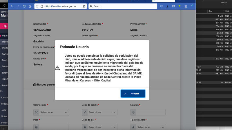 Ahora bien, el 13 de marzo de 2023 pudimos constatar que en la nueva plataforma SAIME hay un espacio dedicado a la solicitud de CI. Probamos la app para ver si era posible iniciar un trámite de solicitud de renovación de CI, pero el sistema arrojó "..."Usted no puede completar la solicitud de cedulación de niño, niña o adolescente debido a que, nuestros registros indican que su último movimiento migratorio del país fue de salida, por lo que se presume se encuentra fuera del territorio venezolano..."
